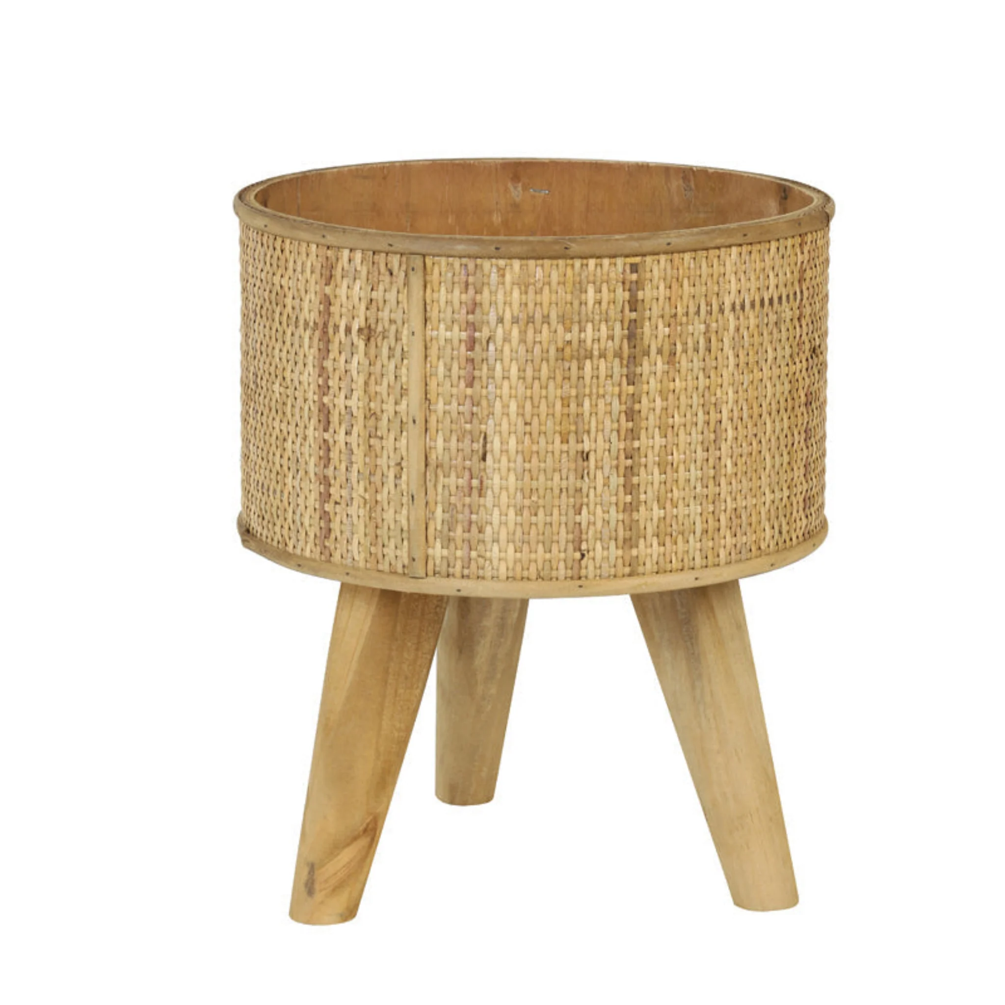 Stylish wooden plant pot on three legs.